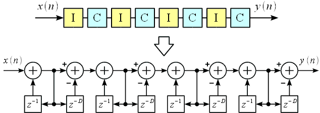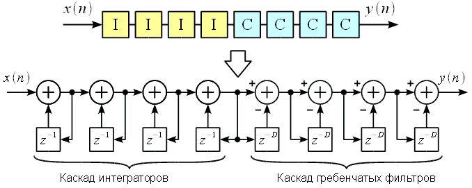 тогда каскад интеграторов гребенчатых фильтров будет иметь