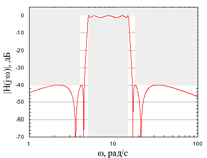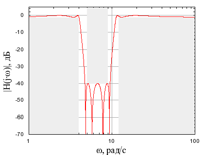 Рисунок 9: АЧХ режекторного фильтра, рассчитанного по заданному коридору АЧХ