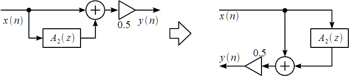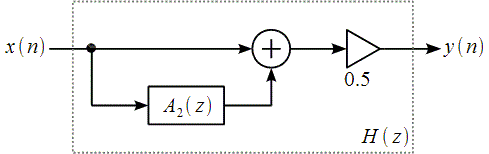 Рисунок 1: Режекторный фильтр на основе всепропускающего фильтра второго порядка
